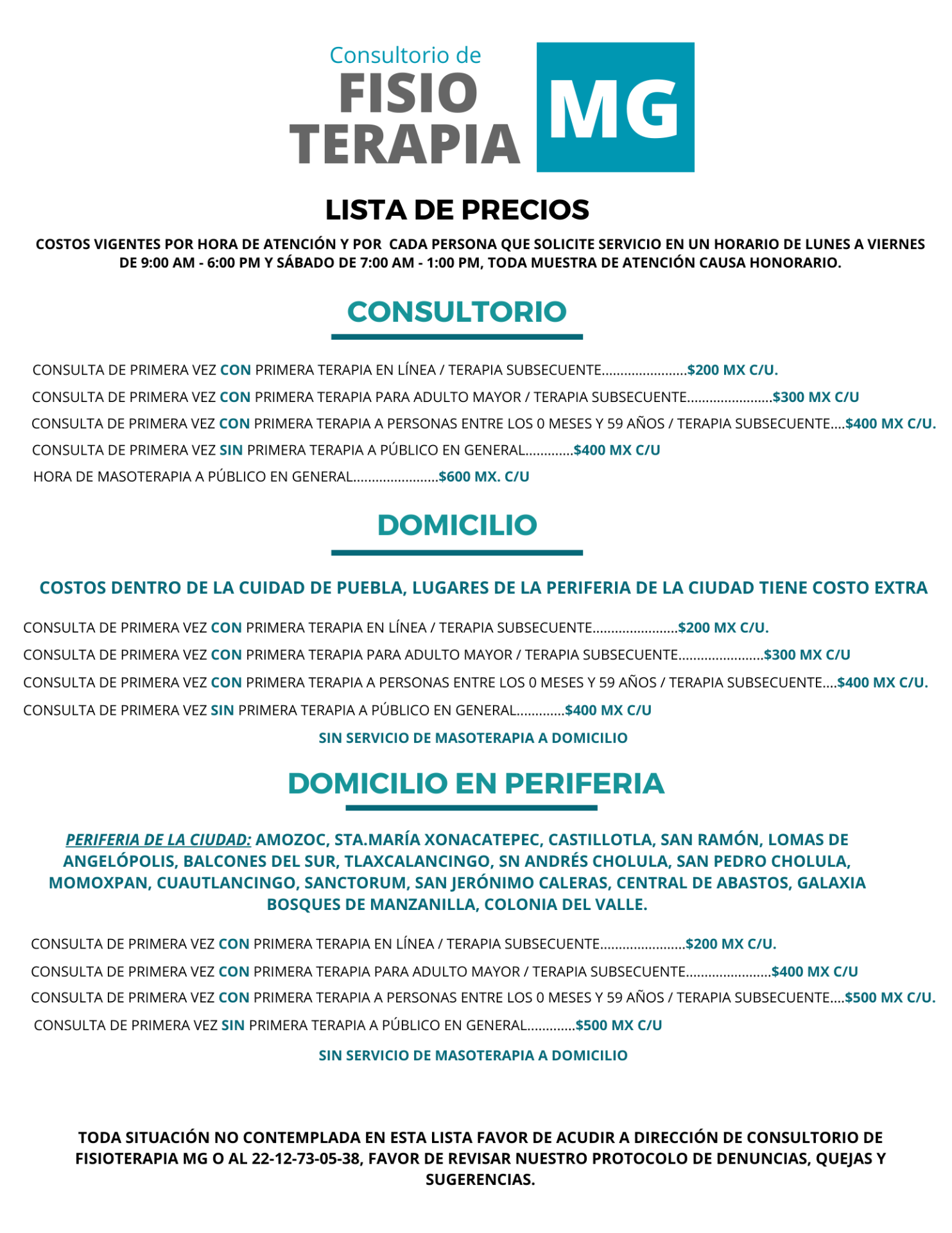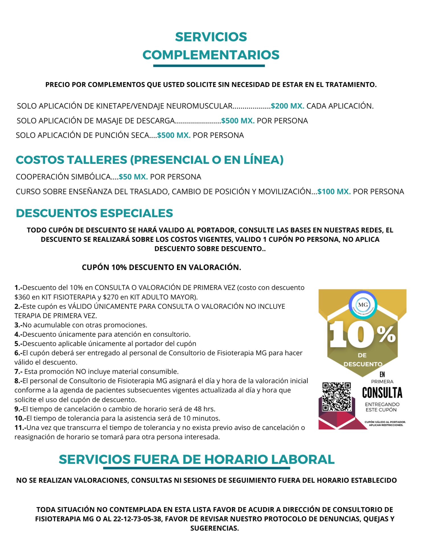 En las instalaciones del consultorio se realiza valoración inicial, se aplica tratamiento con alguna técnica de termoterapia, crioterapia, electroterapia, ejercicio terapéutico, etc. a cargo del licenciado en turno.